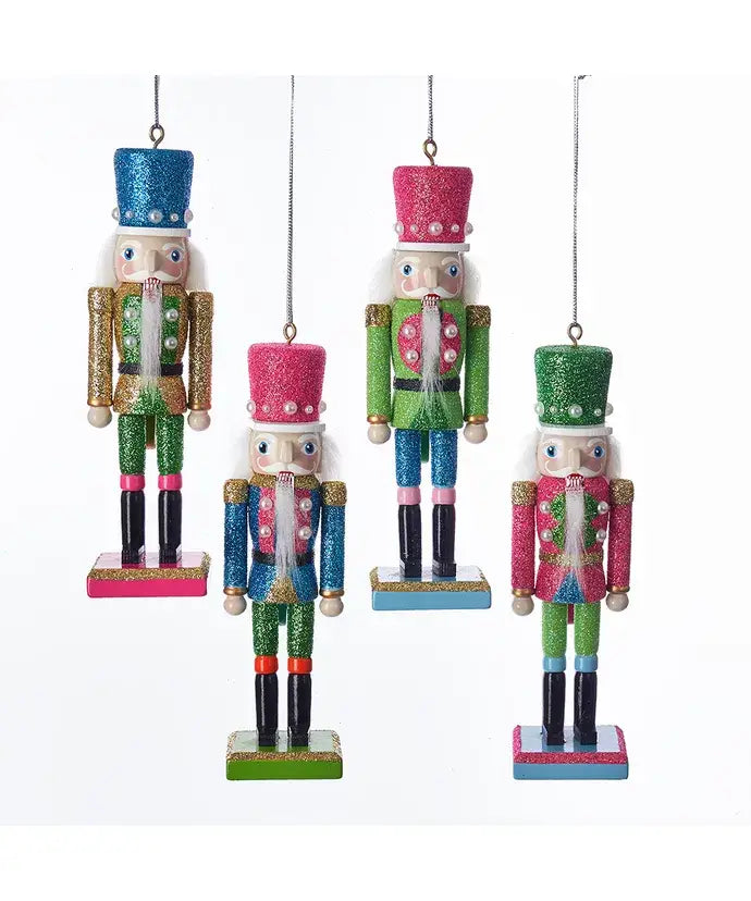 Celebrate the holidays in style with these bright color nutcracker ornaments with pearls from Kurt Adler! The ornaments feature nutcrackers in colorful uniforms embellished with white pearls. The nutcrackers stand on blue, pink, and green bases.